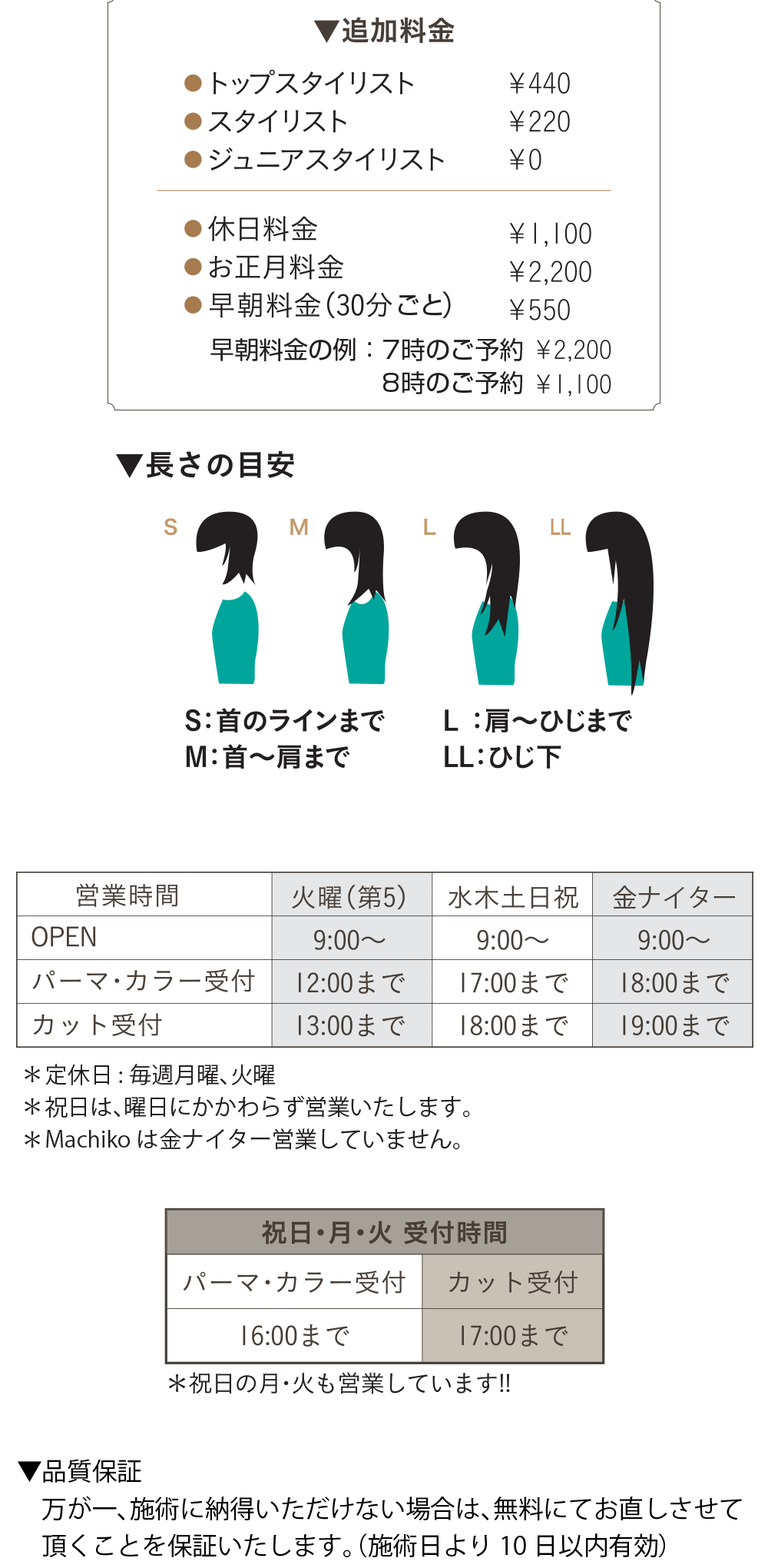 | ●パーマ | S¥7,700(税込) | M¥8,250(税込) | L¥8,800(税込) | LL¥9,350(税込) |