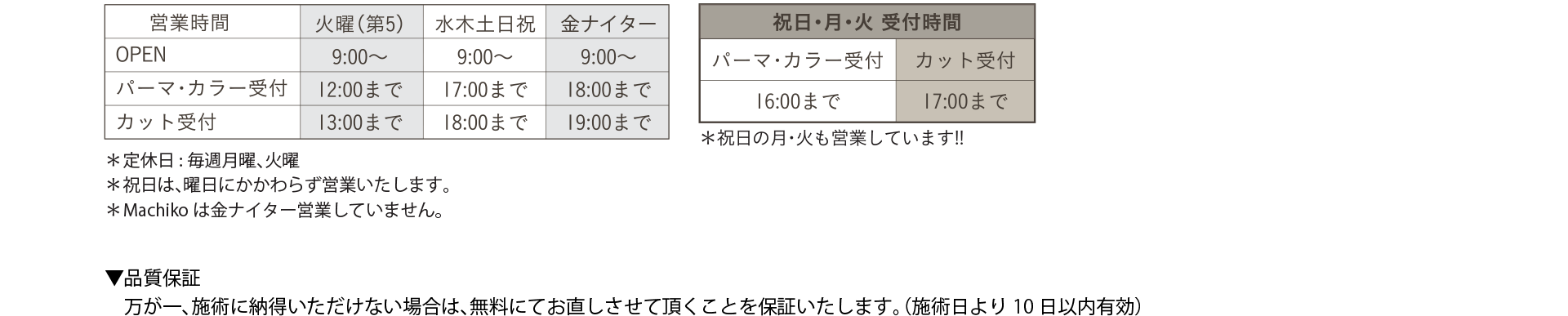 | ●カット+パーマ+Wカラー | S¥22,550~(税込) | M¥24,750~(税込) | L¥26,950~(税込) | LL¥29,150~(税込) |